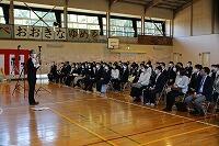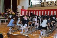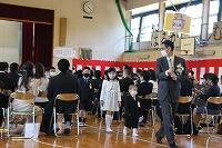 5年生は校庭のクイズでドッジボールコートは何面?あるか聞いています。6年生は先生クイズ。校長先生のものまねもありました。最後は本物の校長先生です。「1年生の皆さん。6年間できれいな花を咲かせてください」