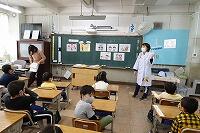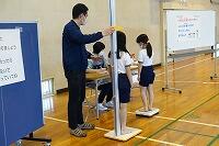 4月は身体測定や各検査が全学年でおこなわれます。白衣の先生は新しい理科支援の先生です。