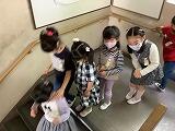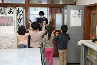 これは先月の学校探検の様子第2弾です。2年生が中継をして1年生に学校の様子を伝えます。校長室のいすに座る子もいました。