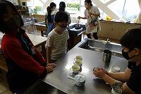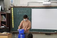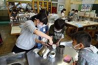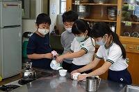 5年生が家庭科の授業でお湯の沸かし方でお茶を入れています。まんえん防止中なので人数を半分にして、香りや色を楽しみます。調理室を使うのは久しぶりです。
