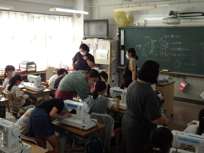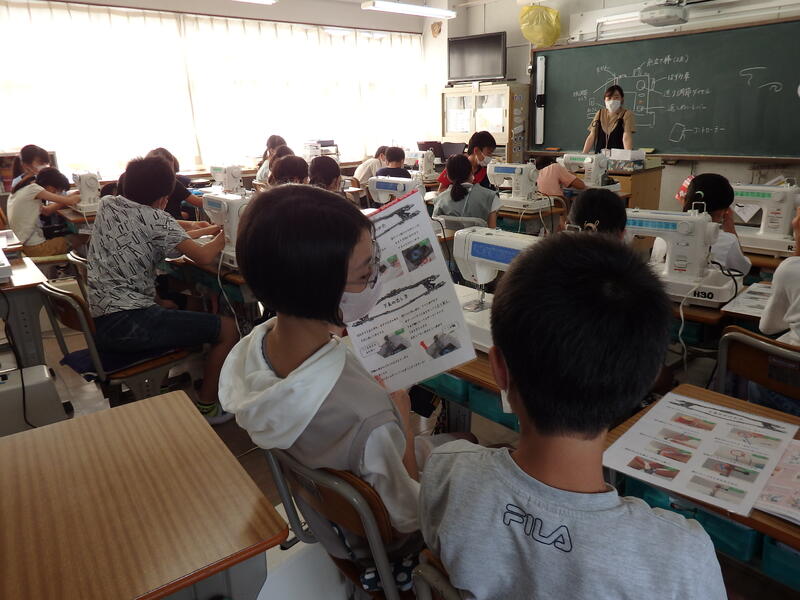 2学期がスタートし、5年生はミシンを使った学習活動に入りました。そもそも子ども達は家庭でミシンを使ったことがあるのでしょうか。実のところミシンは、いろいろなものを縫うことができる機械なので、暮らしの中のあらゆるところで活躍しているのです。子ども達は、ミシンを見て「かっこいい」「すごーい」「わぁ動く」「難しそう」など。いよいよセッティング開始。子ども達は下糸の準備や上糸の準備等、ミシンのセットに興味津々ですが、なかなか難しいものです。でもとても楽しそうです。