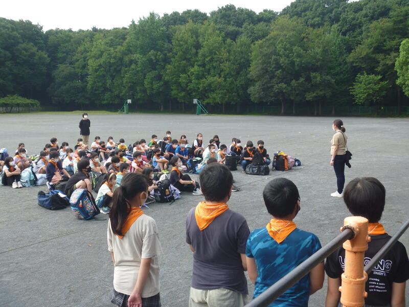 早朝に少し雨が降っていましたが、登校時には雨も上がり、予定通り出発の会を校庭で行いました。今回の林間学校のめあては、「みんなで協力して、笑顔で終われる林間学校にしよう。」です。出発式を終え、8時23分に学校を出発しました。