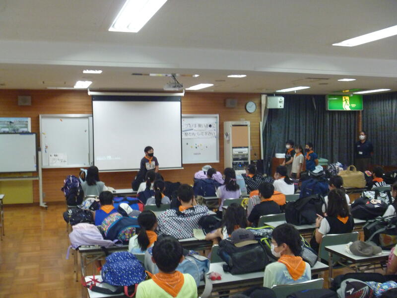 朝食後に部屋に戻り、部屋をきれいにして、自分の荷物を確認し、多目的ホールに荷物を移動しました。2日目の活動は、「体験学習」でした。農業体験と釣り体験に分かれての活動でした。