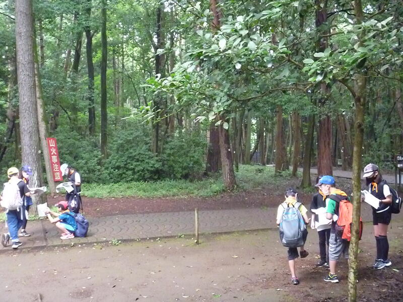 最初の活動は、ウォークラリー【この木なんの木】でした。歩きながら指定された樹木を探し、ヒント資料を参考に木の名前もシートに書き込んでいきます。これ、子ども達には、なかなか難しかったようでした。それに加えて先生達からの「お題」もあり、グループで協力して、頑張っていました。