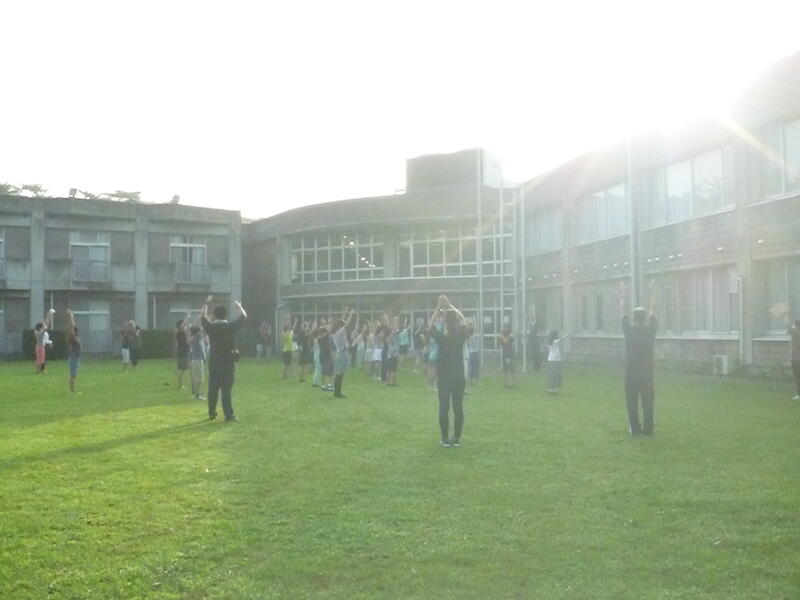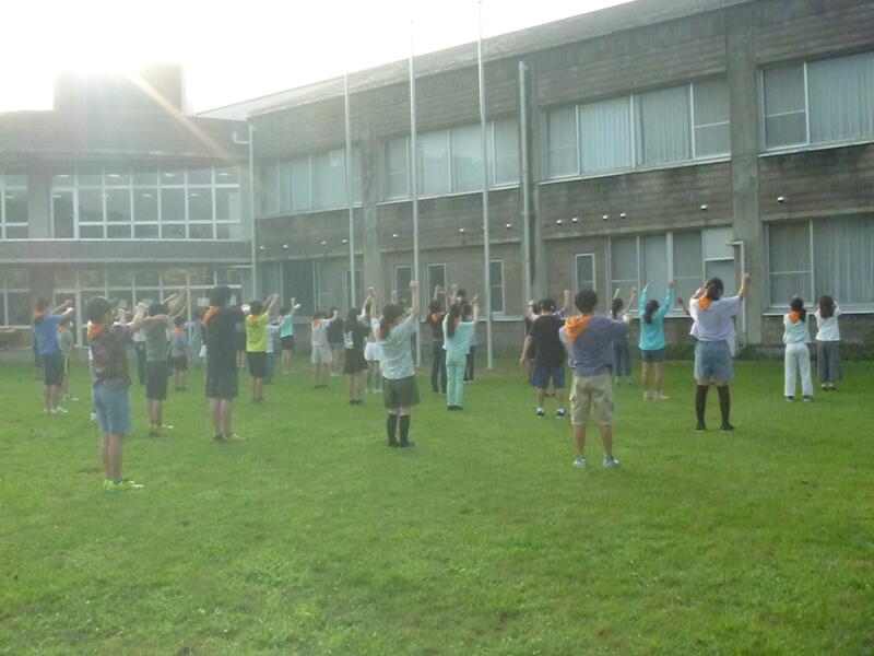 朝の集いでは、挨拶や話のほかにラジオ体操も行いました。気持ちのよい空気は、藤心小の朝の空気によく似ていました。体操をしたら、子ども達はもう活動モードにすっかり切り替わりました。