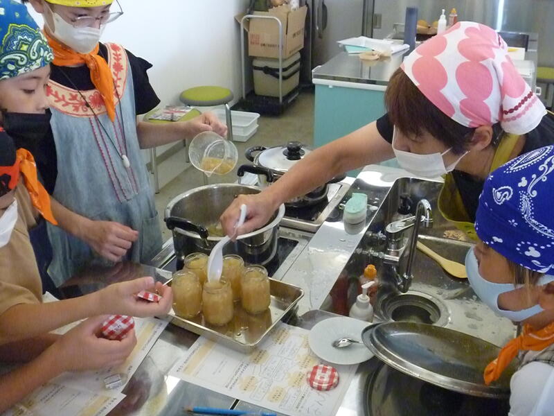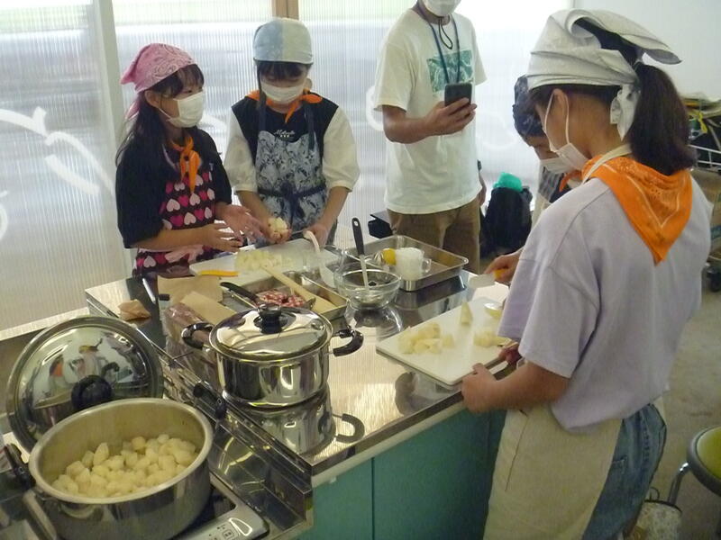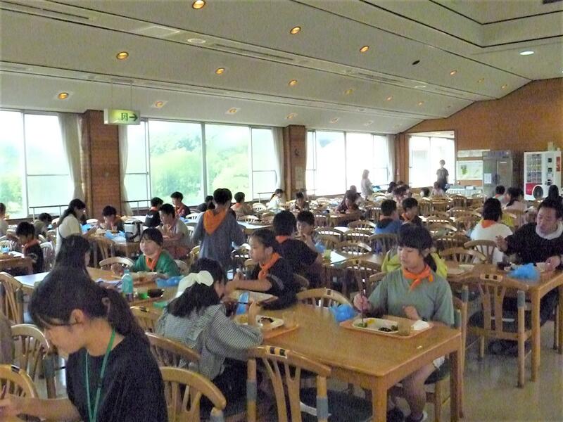 男子はご飯大盛りの子が多く、おかわりもするほど食欲旺盛でした。食べた後は、みんなで協力して片付けもしっかりとしていました。自分のグループ以外の手伝いも進んでしている姿がよかったです。