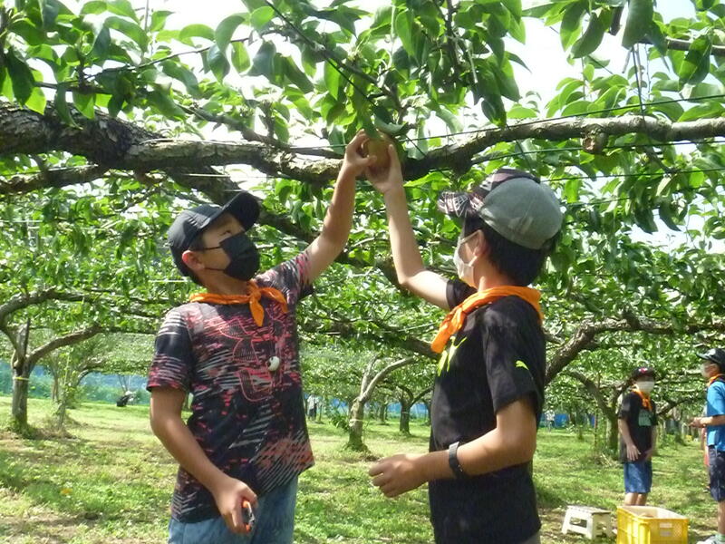 たくさんの梨をグループで協力して収穫しました。プルーンの実も食べさせてもらいました。