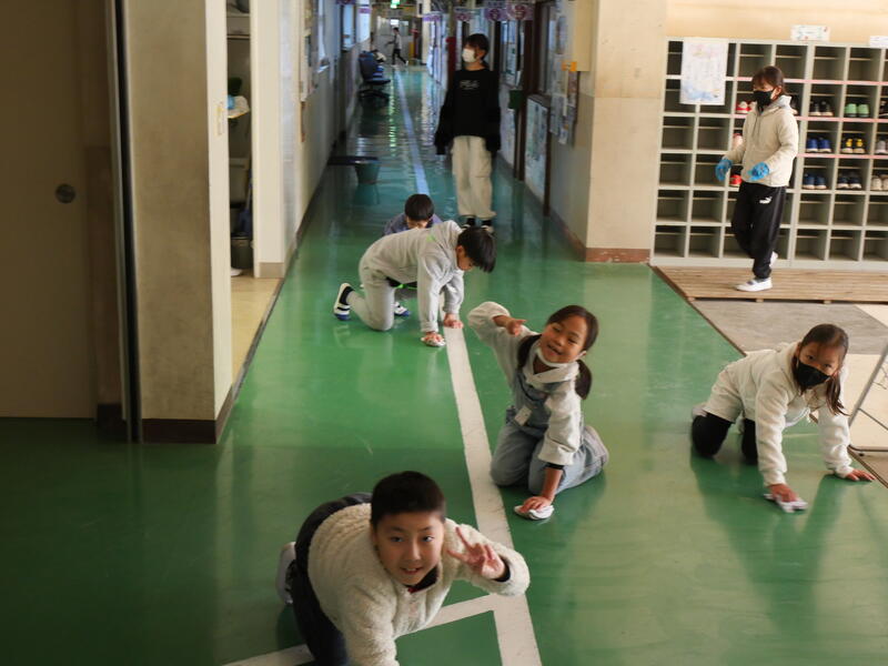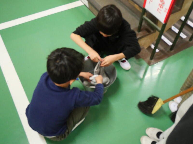 3学期初めての清掃活動も一生懸命。特に水拭きをしている藤っ子は、冷たい水、冷たい廊下でも頑張ってくれていました。