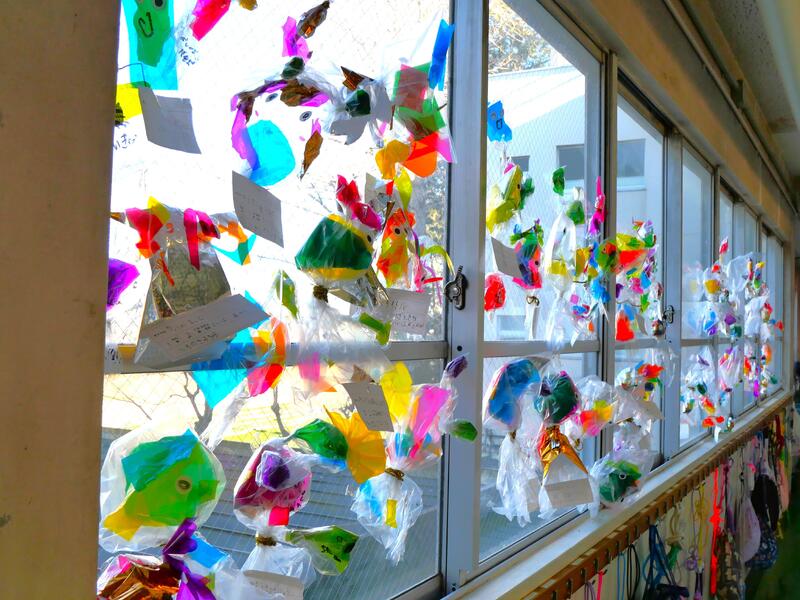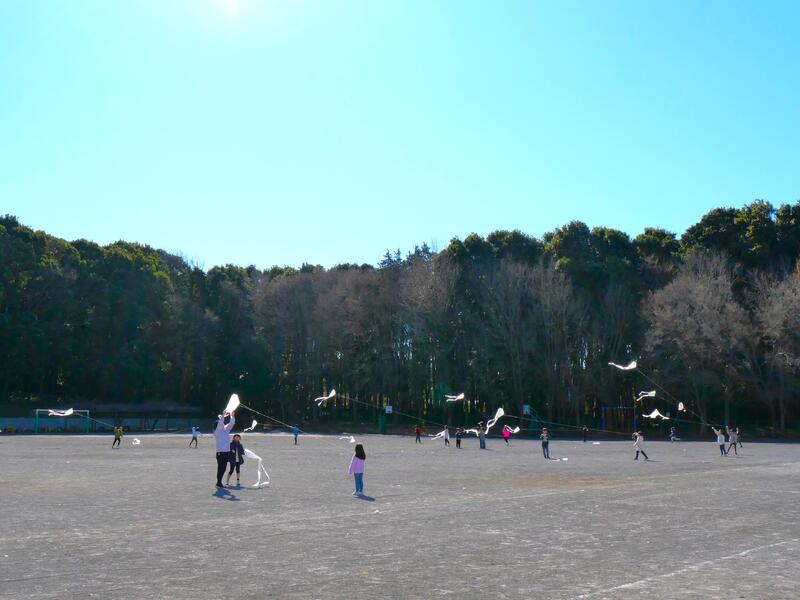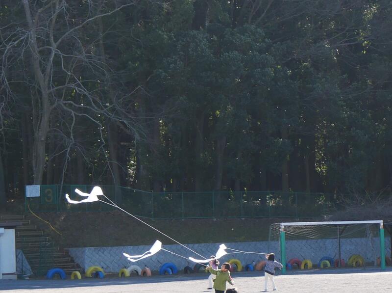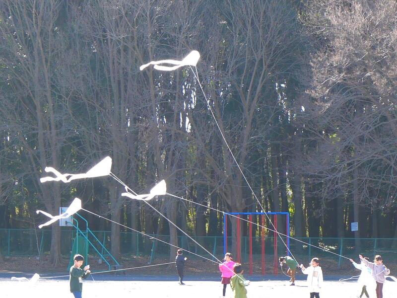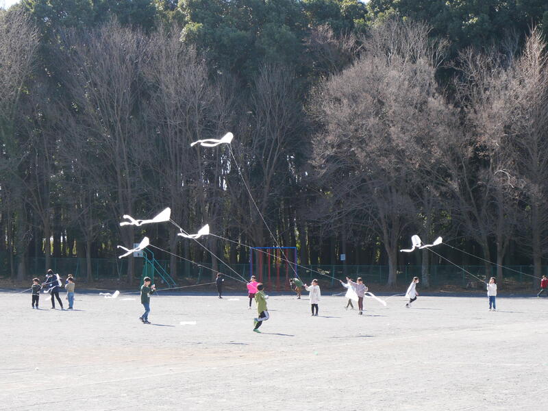 1年生が、この風を利用して凧あげをしていました。藤っ子たちが作った凧が、風に乗って上がっていきます。みんな楽しそうに凧あげをしていました。