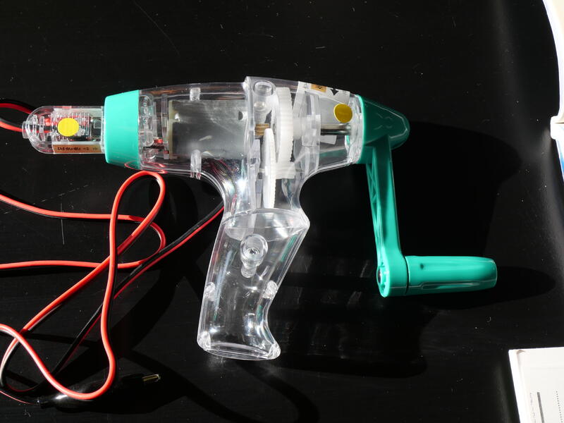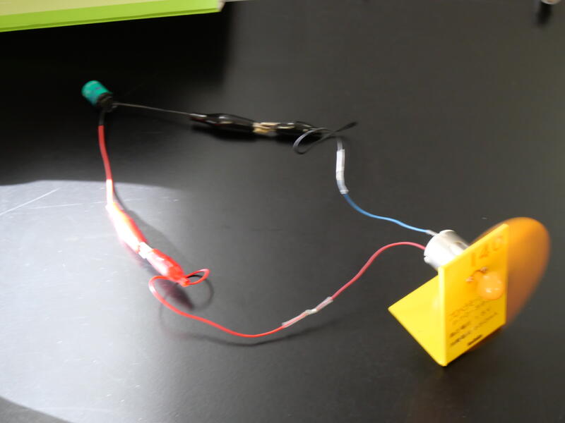 手回し発電機を回し、コンデンサーに電気をためていきます。取り外して、次は、コンデンサーに豆電球や発光ダイオード、プロペラ付モーターをそれぞれつないでみます。豆電球も発光ダイオードもプロペラ付モーターもちゃんと反応しました。