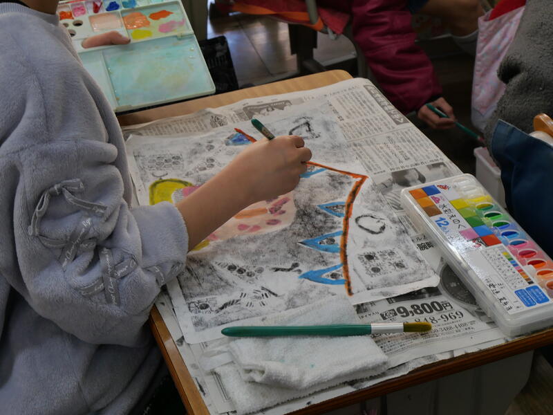 「彩色版画」は、このあと基本の版画を裏返して、絵の具で色を付けていきます。色を塗りながら表面を確認し、色の付き具合を調整していきます。実に楽しそうです。