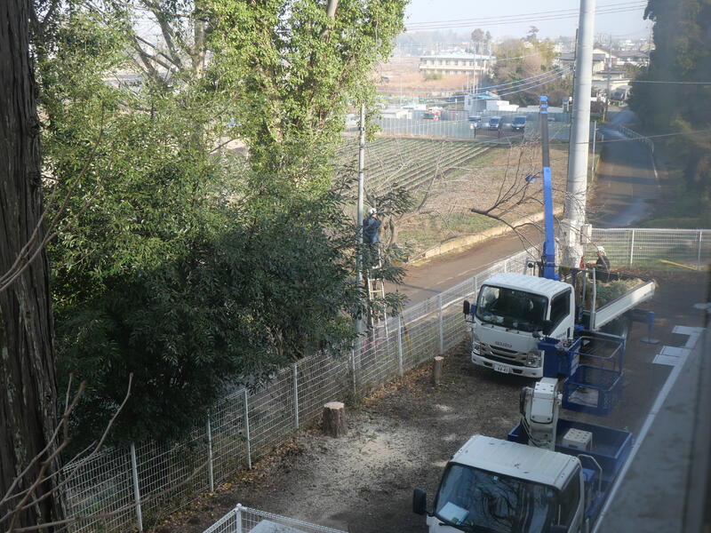 今、藤心小では、校舎の裏側の高木の伐採や剪定作業をしています。強風によって枝が折れて落下したり、葉が給食室や校舎の屋上にある排水口につまったり、中には枯木もあったりということで、環境面・安全面を考慮して学校環境の整備の一環で行っています。