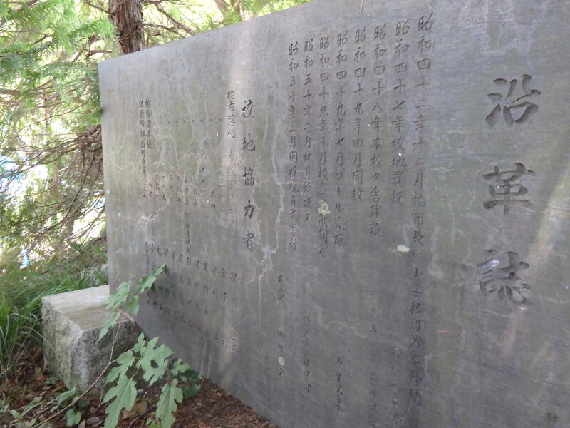 門を入ってすぐ正面に、堂々とした「校章と校歌」の石碑があります。裏側には、「沿革史と校地協力者の方のお名前」があります。11名の方が土地を提供してくださいました。