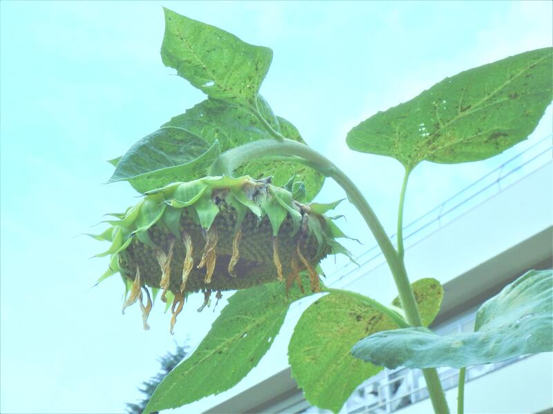 8月14日の朝、学校内外の施設設備等点検時の様子です。シーンと静まりかえり、まだ、どんよりとした雲に空が覆われていました。花壇のひまわりも元気でした。
