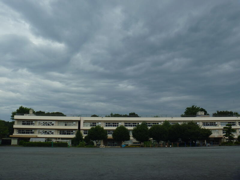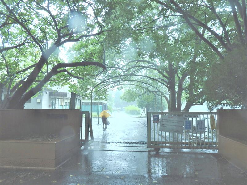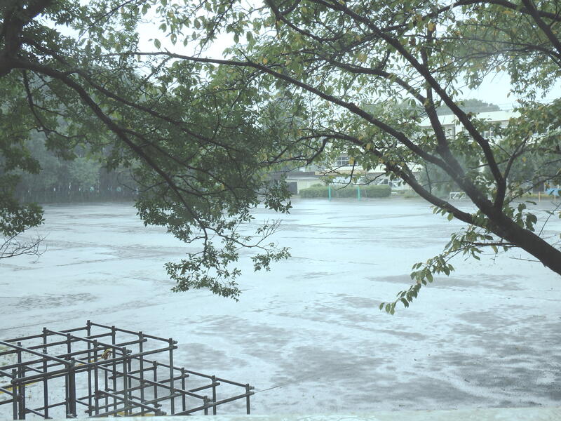 前日の夜に台風が関東地方を通過しました。小型の台風でしたので、風はそれほど強くありませんでしたが、雨量はやはり多かったです。校庭の地面が雨の勢いで波打ったような模様になっていました。