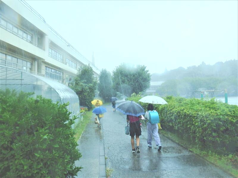 子ども達が、たくさんの荷物を持ちながら登校してきました。みんな元気に挨拶をしてくれました。びしょ濡れなのに何だか楽しそうなのが子どもらしくてほっとしました。先生たちも大雨の中、通学路へ見回りに行ってくれました。一緒に登校してくださった保護者の皆様、ご多用の中、早朝よりありがとうございました。