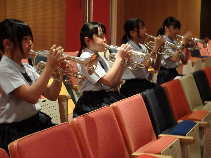 おそらくホールにいたほとんどの人が、曲のスタートから楽しさ溢れるリズムとメロディーを予想していたと思いますが、意表をつく静けさ漂う神秘的な曲の入りに、ホールの雰囲気が藤心ワールドに包まれた感じでした。その後は軽快でポップなサウンドに変わり、海の中の楽しい世界の様子をブラスバンド部の藤っ子みんなで表現していました。発表が終わると、ステージにいた藤っ子の笑顔が輝いていました。とても素敵な発表でした。