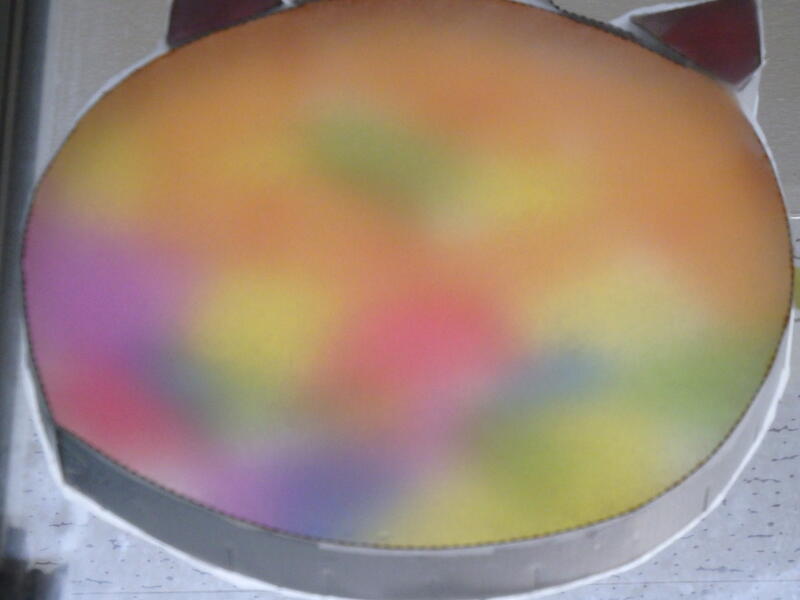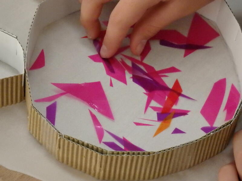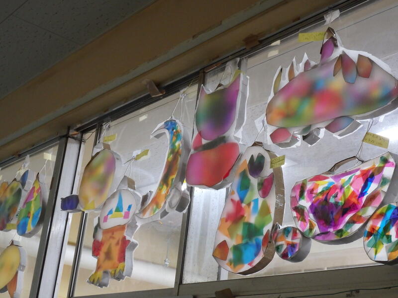 カラーセロファンを使って、切ったり重ねたりしながら色合いを考えて貼り付けていきます。子ども達の発想は一人一人違っていて、とてもおもしろいものです。