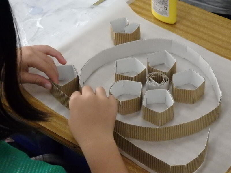 今日の藤心は、とてもきれいな青空が広がっています。校庭に出て過ごしやすい気温です。3年生の図工では、光をデザインに利用する工作に取り組んでいました。