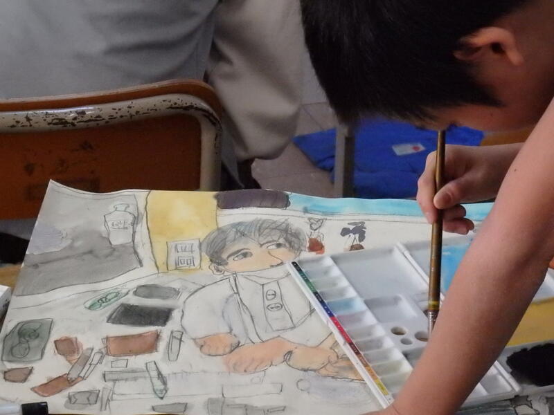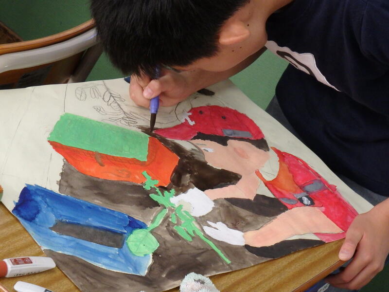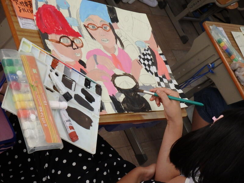 5年生の図工では、9月に実施した林間学校の思い出を描いていました。一枚一枚、その日の様子がよくわかる作品になっています。