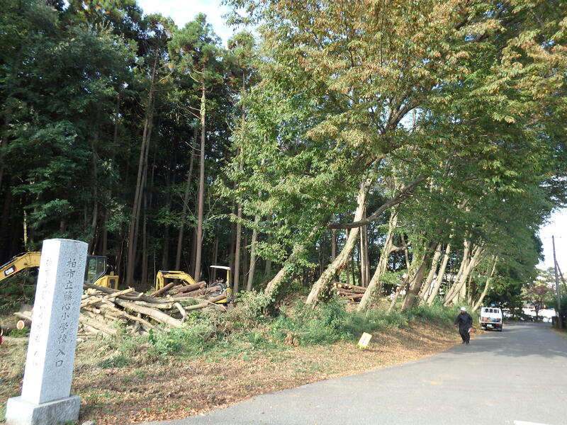 現在は、まだ、通路沿いの傾斜した樹木は残っていますが、この樹木も全て伐採するそうです。正門前が開放的になり、道路からも学校が見えるようになります。同時に缶・ビン、小型家電などのごみの不法投棄がなくなれば学校としてもうれしい限りです。