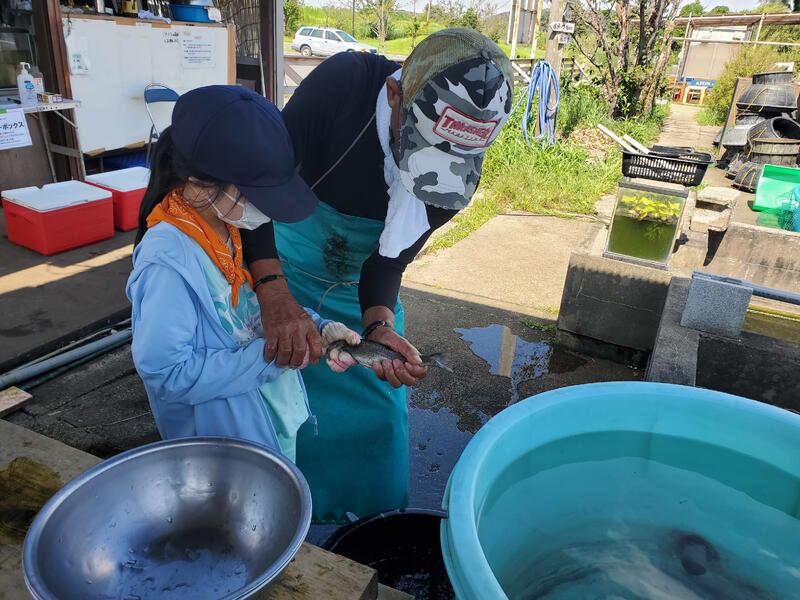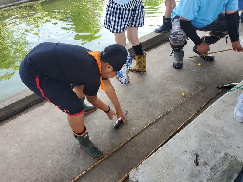 【釣り体験】釣り針にえさをつけて、魚釣りスタート。えさをつけるのも初めてだと難しく感じます。