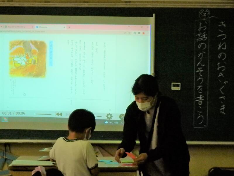 こちらの授業の様子は、2年生:国語「きつねのおきゃくさま」の導入場面です。初発の感想を一人一人個々で書き出す時間で、学習問題は「お話の感想を書こう。」となっていました。