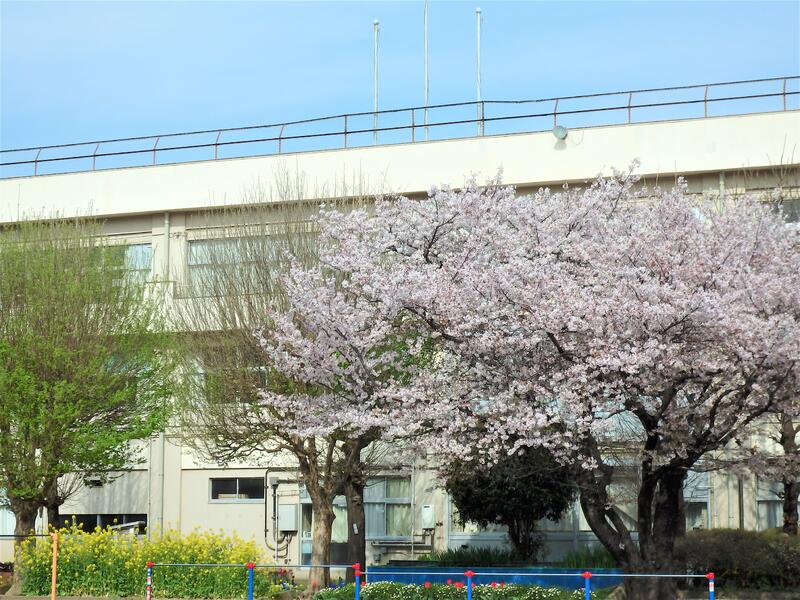 サクラも満開を過ぎ、サクラの花びらが藤心の風の動きに合わせて校庭を綺麗に舞っています。校庭の周囲の木々も冬の間の寂しい色とは違い、新しい緑を見せはじめ輝いています。