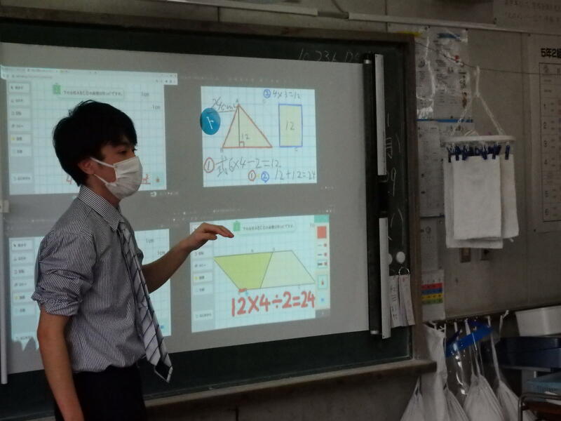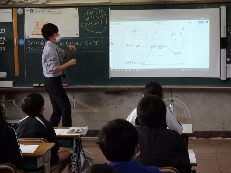 5年生は「面積の求め方を考えよう」の学習。扱う図形は台形で、台形の性質に着目して、面積の求め方を考える場面でした。この単元では、「Dマークコンテンツ」を活用していました。Dマークコンテンツを使うと、図形の面積の求め方を考えるとき,画面上で自由に補助線を引いたり,図形を切って移動させたり,回転させたり,コピーさせたりといった作業を行うことができるので,多様な考え方を引き出すことができます。