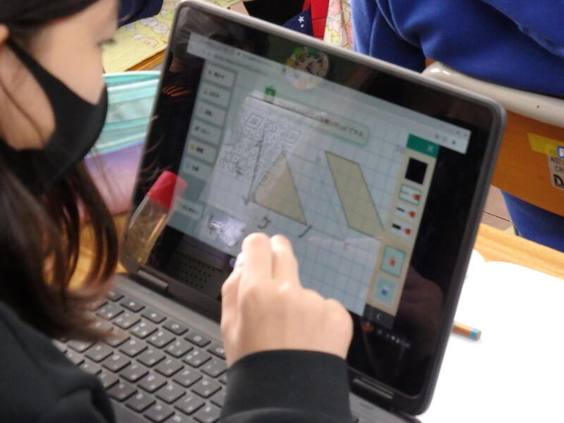 子ども達は、端末操作には慣れたもので、どんどん考えを画面上に表現していきます。いろいろな考えをしているようでも、変形したり、分割したり、つけたしたりすることで、既習の求積できる図形にして考えるということは一緒です。そして、その中でも、今回の場合、素早く簡単に正確にできるのはどの考えかを見定めるのも大切です。