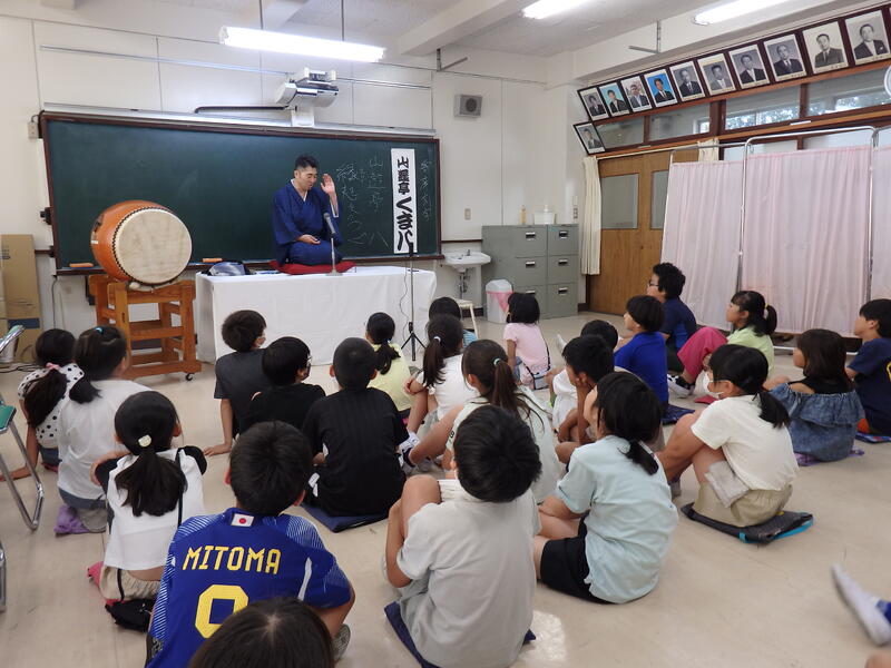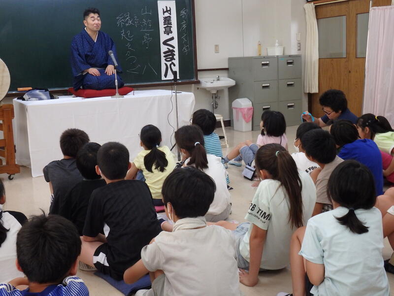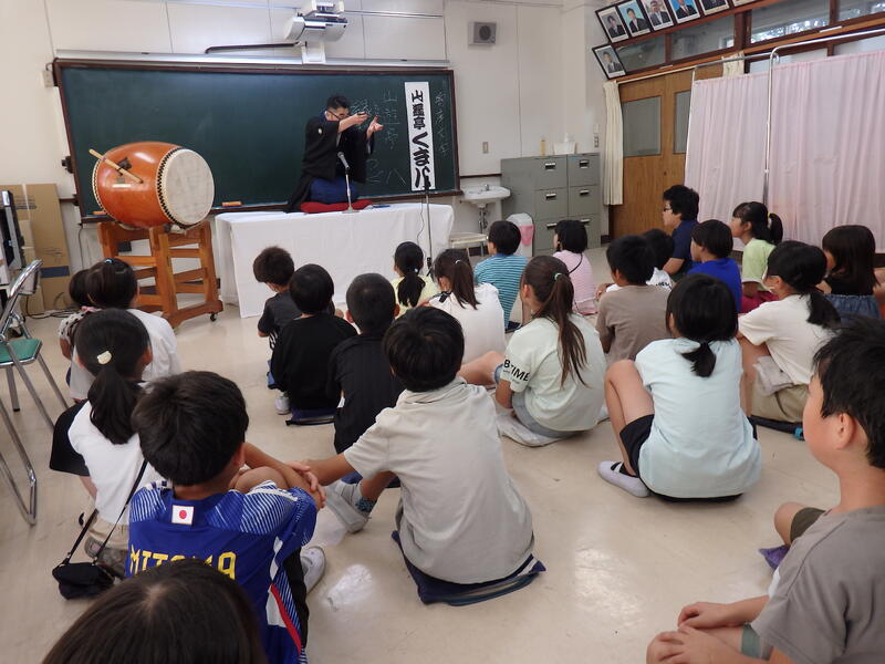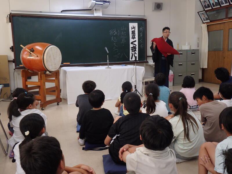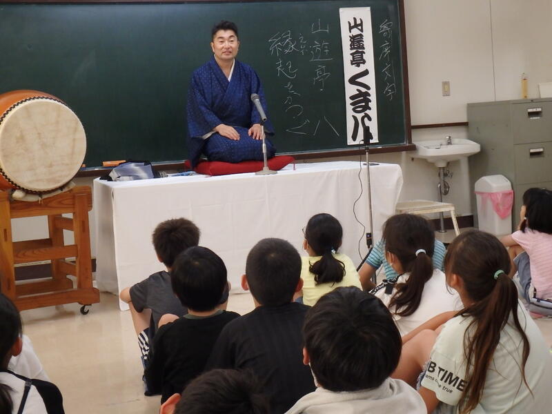 今日の藤心は、3日連続の熱中症警戒アラート発令の通り、ジリジリの暑さです。午後1時の気温は36.1度。今日は特別講師として落語家「山遊亭くま八先生」をお迎えし、「藤心小・落語教室」を実施しました。子ども達は、ライブ体験できるとあってワクワク。まずは、落語について、いろいろなお話を聞きました。