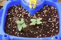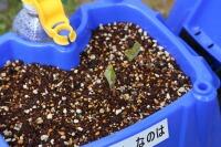 1年生が毎日水をあげているあさがおの芽が出て双葉になりました。