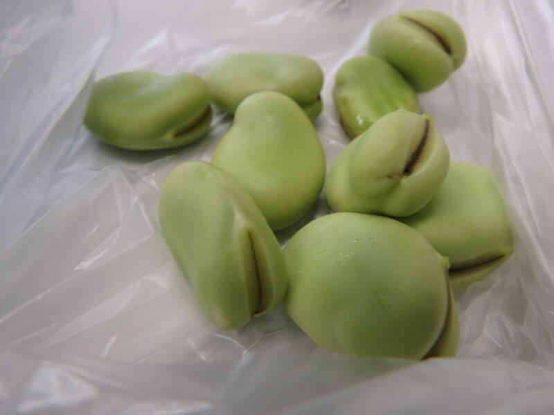 説明が終わり、一人一人、さやむきの体験です。一つ一つが大きいことにびっくり。中には何個のそら豆があるのか、振ってみると音がするのか、光に当てると中が見えるのかと考えたあと、みんなでさやむきを楽しみました。さやをむいた時に、床に落ちないように、丁寧に作業していました。