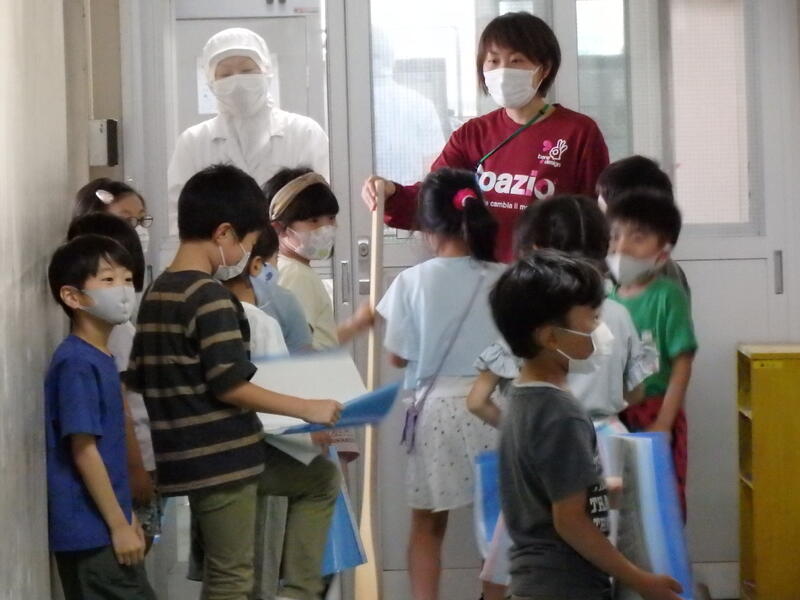 給食室は中に入ることができないので、入口の所でいろいろな話を聞いていました。調理に使っている道具も見せてもらいました。お家で使うものよりかなり大きいのでびっくりしている様子も見られました。