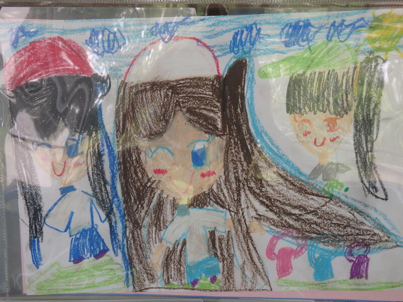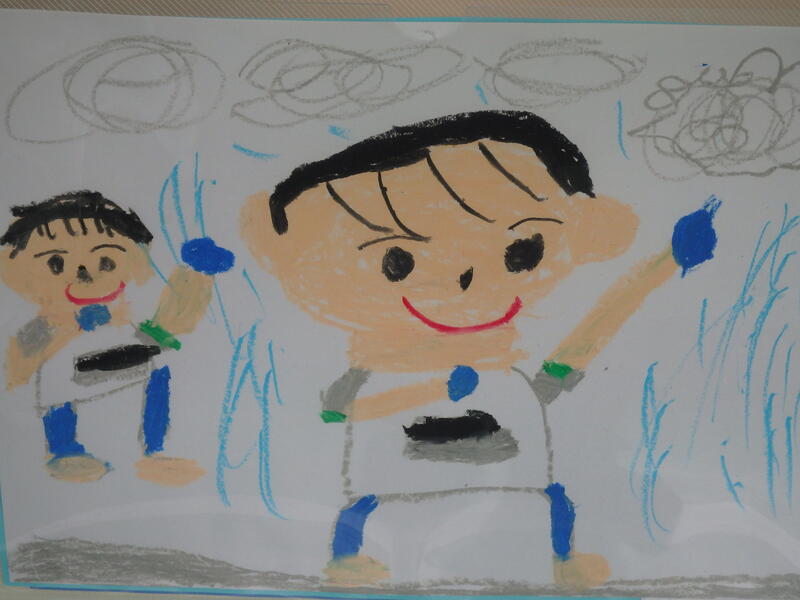 一番多かったのは、やっぱり表現(ダンス)種目でした。練習をいっぱいやって、当日はバッチリ踊れていたので、当然だと思います。ある子の作品では、太陽がしっかり姿を見せていて、キラキラ輝いて踊っている様子が描かれていました。テントと椅子があるので、運動会当日の絵です。この絵みたいに天気のいい日だったらよかったのになぁという気持ちの表れかもしれません。