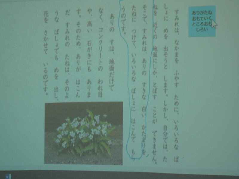 予想の発表は、拡大投影機を使って、予想の絵をもとに順序立てて説明していきます。所々で先生もフォローをしっかりしてくれていたので、安心して発表していました。
