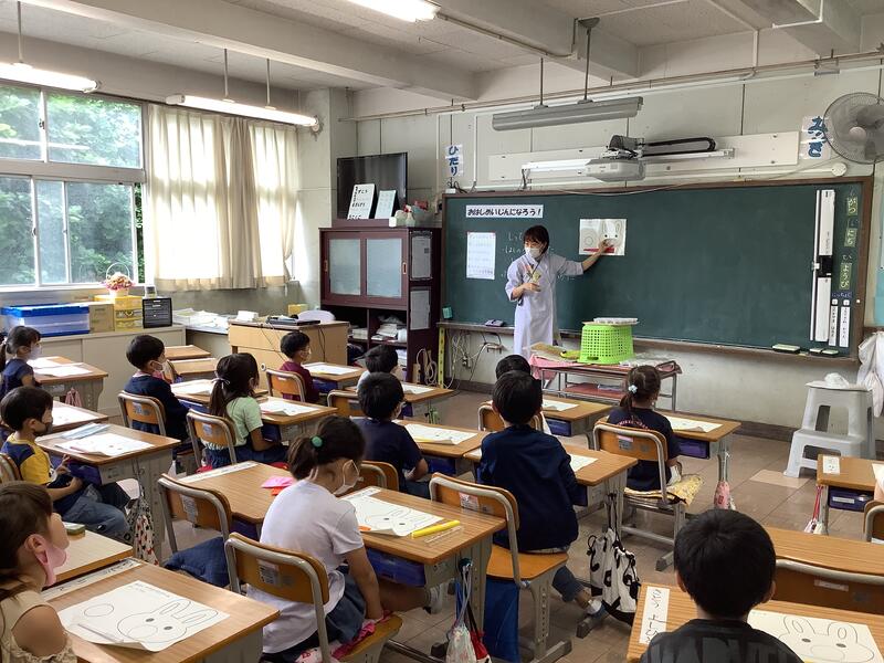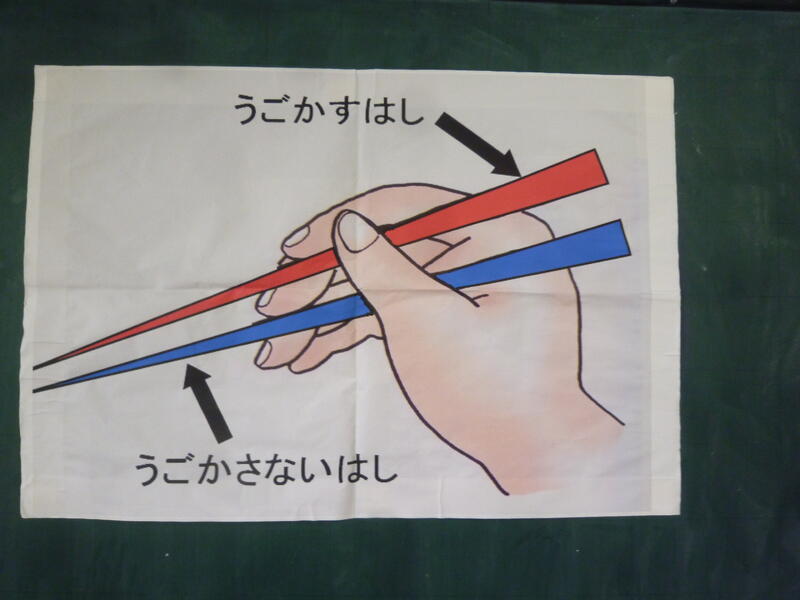 1年生が藤心小学校の栄養教諭の指導で、お箸の使い方を学ぶ活動をしました。日本人の食事には欠かすことのできないお箸。お箸を上手に使うことは、一緒に食事をする周りの人への思いやりの心をもつことにつながる大切な食事のマナーです。