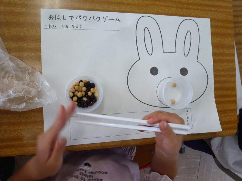 お箸の正しい持ち方を学んだので、再度、「おはしでパクパクゲーム」。動かす箸と動かさない箸を意識して、真剣に取り組んでいました。