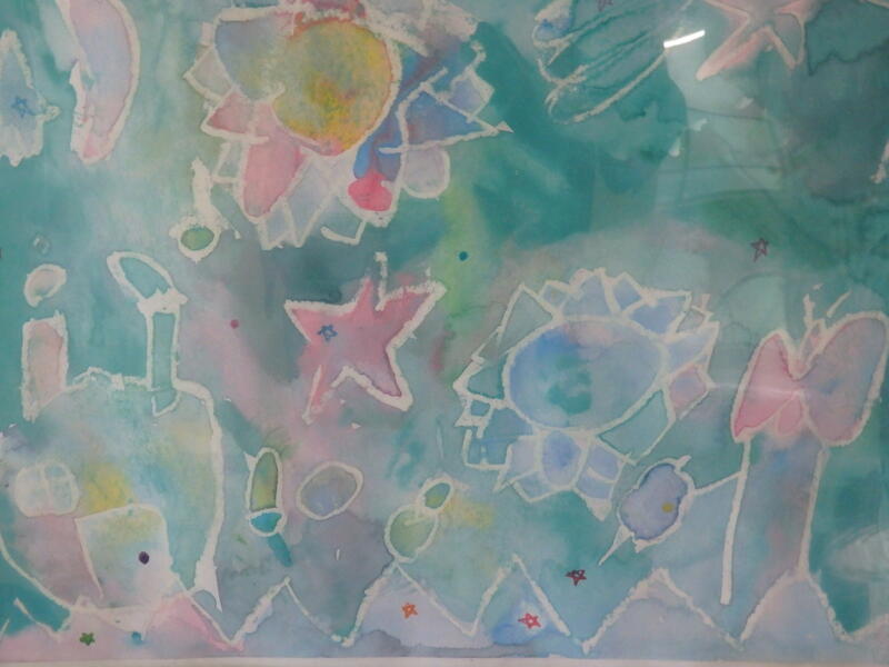 6年生の掲示板には、楽しかった修学旅行の思い出シーンがまとめて掲示してあります。忘れることのできない貴重な思い出です。3年生の教室前廊下には、絵の具のにじむ性質を使った作品が掲示してあります。水彩画のよさは、淡い色から濃い色まで、絵の具の濃さで自由に色を変えることができるところ。その中でも特にグラデーションは、水彩絵の具を使う最大の魅力です。表現の広がりが児童個々で違い個性と感性と偶然性のコラボです。見ていて飽きない作品の数々です。