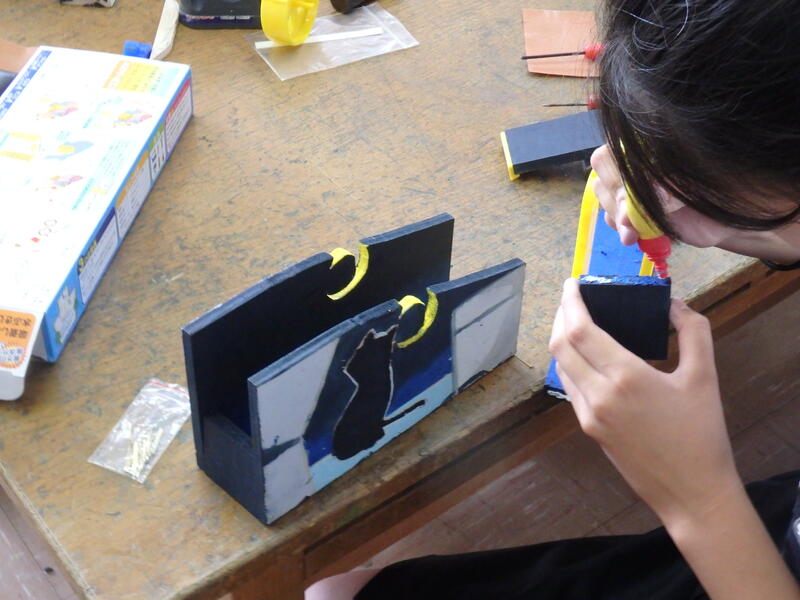 6年生の木工作「テープカッター」もいよいよ仕上げに入ります。様々なデザインに様々なカラーで色づけ。そして、丁寧に組み立て、ニスをぬり、世界にひとつだけのオリジナル作品を作り上げます。完成が楽しみです。