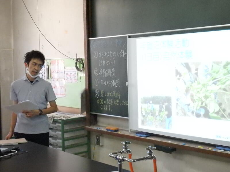 暑さのため、今日、午後4時から体育館で予定していた「林間学校説明会」もエアコンのある理科室に会場を変更しました。学年主任から日程や持ち物、お願い等の説明がありました。
