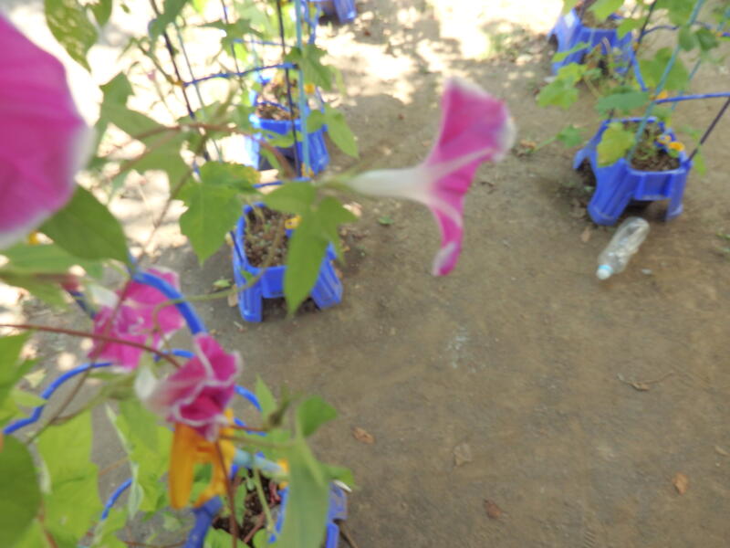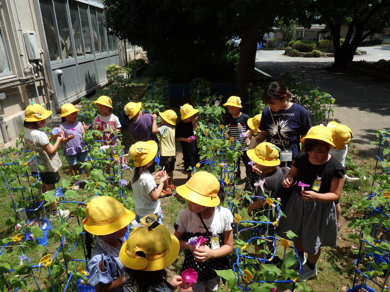 1年生がアサガオコーナーで活動していました。暑い中でしたが、何だかとても楽しそうでした。自分の鉢からアサガオの花を取り、教室に戻っていきました。教室で何かをするのかな。そう思っていたら、放課後、教室に行くと廊下に「アサガオのたたき染め」の作品がありました。きっと、みんな、喜んだり、驚いたりと楽しく活動したんだろうと想像できる作品になっていました。