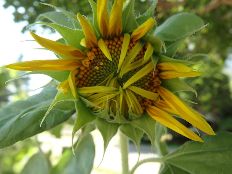 挙は校庭のヒマワリを紹介します。暑い日が続いていますが、校庭のヒマワリは元気です。開花していく様子はこんな感じです。