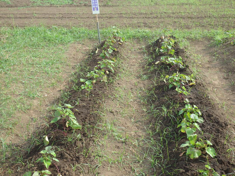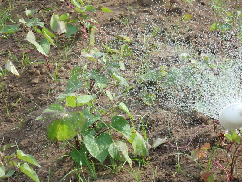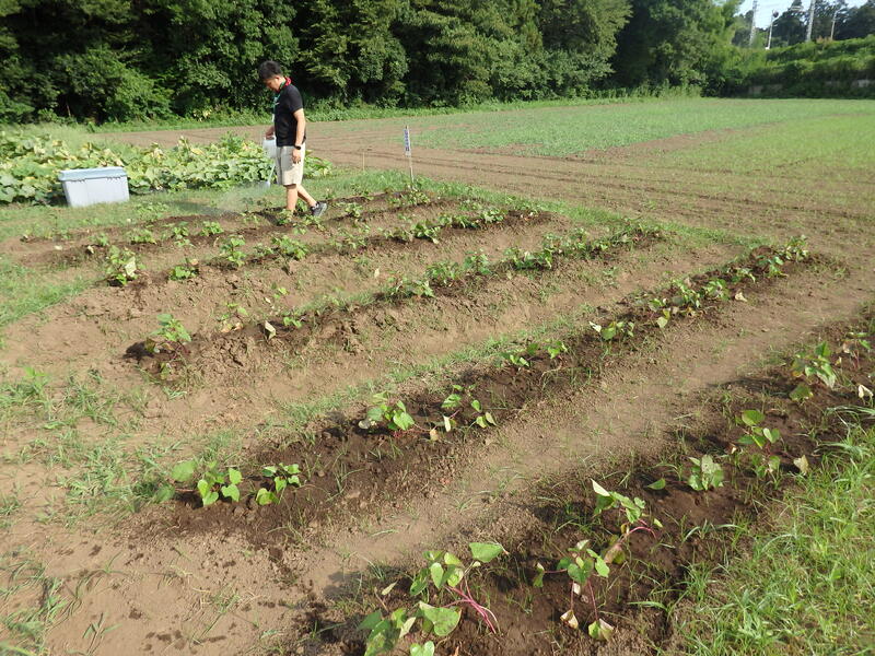 2年生のサツマイモ畑。猛烈な暑さが続いてたので、水やりをしました。順調に育っています。夏休み前には、もう一度、2年生が草取りをする予定です。