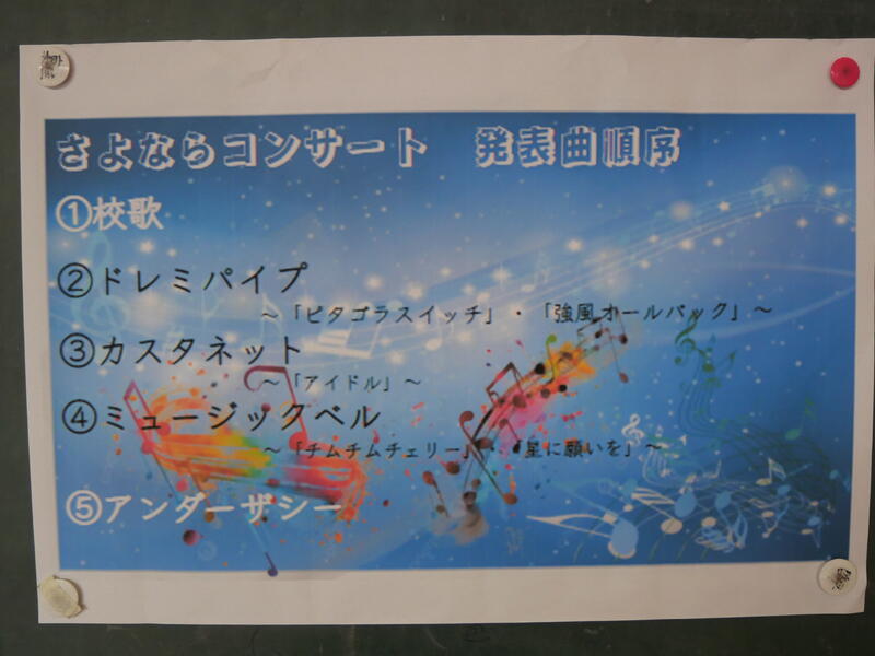 校歌の演奏からはじまり、ドレミパイプを使って「ピタゴラスイッチ」「強風オールバック」の発表、カスタネットを使って振り付けもある「アイドル」の発表、ミュージックベルを使って「チムチムチェリー」「星に願いを」の発表、ラストは「Under The Sea」の演奏でした。