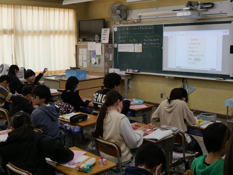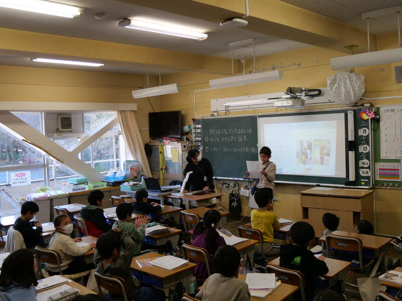 数年前までは、グループ発表では、大判の模造紙にまとめたり、フリップを使って発表したりするのが定番でしたが、一人一台端末が配付されてからは、発表資料もデジタル化が主流になりました。子ども達も端末にインストールされているプレゼン用ソフトを上手に使うようになってきました。