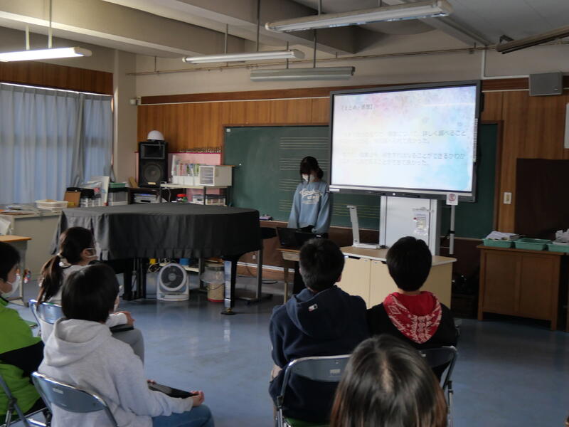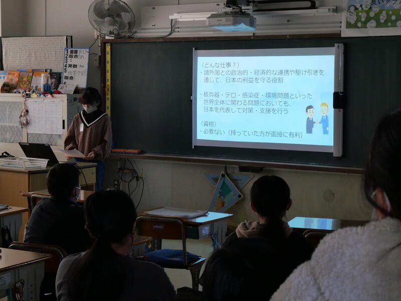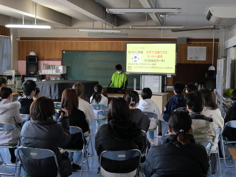 発表の中で、なりたい自分になるために、「今の自分にできること」を発表するシーンがありました。具体的に自分自身ができることを深く考えることで、就きたい職業の本質や自分自身の適性を知ることができたのではないかと思います。ぜひ実現してほしいと思います。終わりのシーンでは、20年後の姿やふり返り(感想)もあり,自分のことを自分でよく見つめて、調べ、まとめた発表だったことがわかりました。