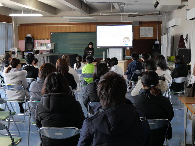 懇談会では、1年間の行事のふり返りや子ども達の様子の紹介、次年度に向けた準備、次の学年で変わることの説明等、各学級で動画や資料をもとに話がありました。
