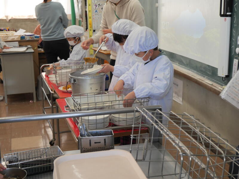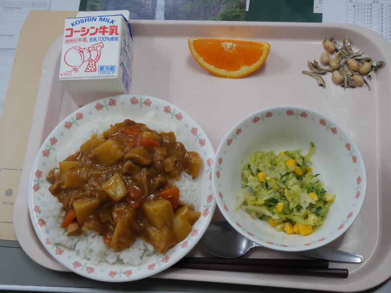 今日のメニューの主役は、みんな大好きポークカレーライス。このカレーすごく美味しいです。1年生はもうしっかりと給食当番ができるようになりました。