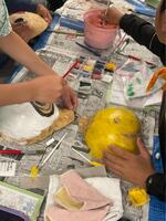 ふくべ細工。説明をよく聞いて、一生懸命作っていました。個性あふれる作品ばかりで完成が楽しみです。